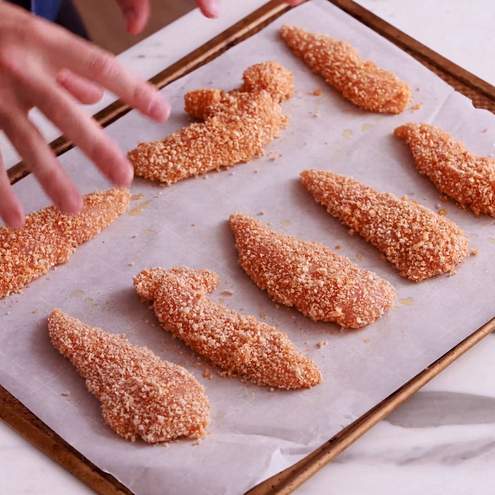 On a lined baking sheet with parchment paper, arrange the tenders. Lightly spray each tender with olive oil spray.
