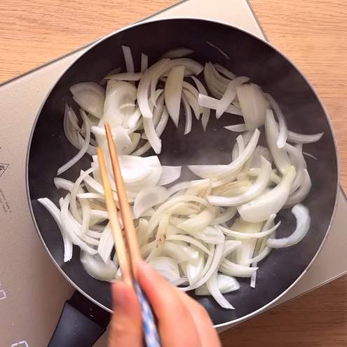 Peel and julienne one onion. In a medium heat pan, cook the onion with olive oil and a pinch of salt for approximately 5 minutes.